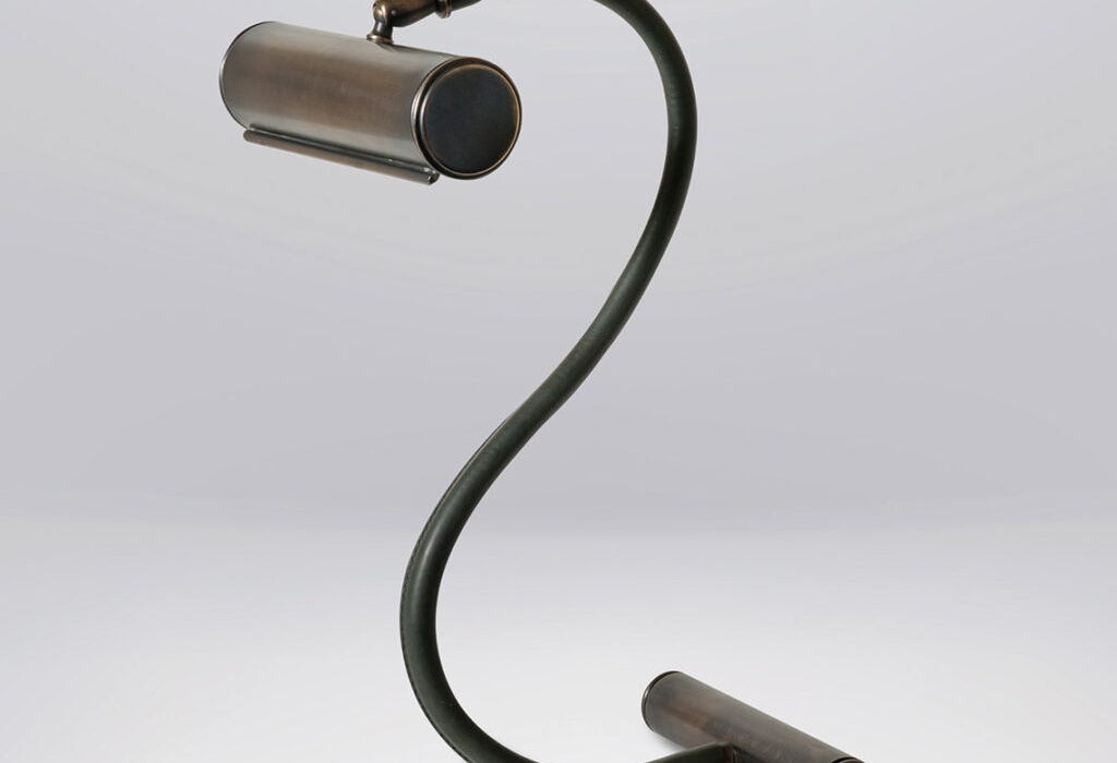 The Herringham beautifully combines an adjustable gooseneck stitched leather neck in an elegant purbeck blue, and a distressed antique bronze finish, brass base and shade.