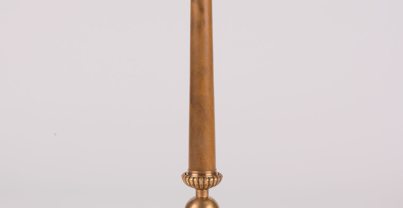 The Reeded Candle Stick features a tapered brass stem shown in an antique silver finish with a turned wooden candle design in antique cream.